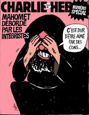 This was a golden opportunity, not only to call out the “jerks” who Charlie identifies as the fundamentalists who make the Prophet cry: “Muhammad overwhelmed by the fundamentalists” (MAHOMET DEBORDÉ PAR LES INTERGRISTES), but the crying man himself and why why he continues to inspire acts of wretched barbarity by followers, whom the Koran has convinced that life is better in the Hereafter . 13:26 Allah enlarges and restricts the provision to whom He pleases. They rejoice at this worldly life, but worldly life is nothing but a fleeting pleasure compared with the life to come. The cover, along with two cartoons of Muhammad, was part of a lawsuit by the Union of French Islamic Organisations and La Grande Mosquée de Paris. One of the cartoons is the one we showed you earlier where the Prophet tells a long line of suicide bombers making their way to heaven to "Stop, stop we ran out of virgins"; in the other, the so-called “turbombe” cartoon, God’s Messenger is drawn with a bomb ready to explode on his head instead of the customary turban.